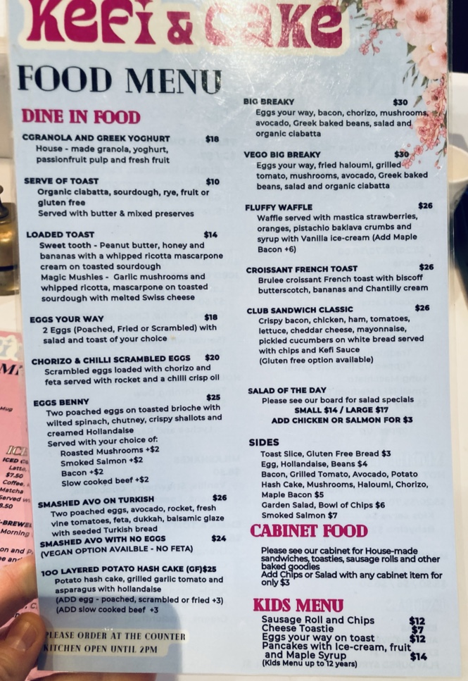 Start your day with a selection from the enticing breakfast offerings, featuring eggs your way on toast or sweet pancakes with ice cream. Sides like smoked salmon and a garden salad elevate your meal to the next level. Kefi and Cake is also renowned for its enticing desserts, which customers rave about for their stunning presentation and irresistible taste.